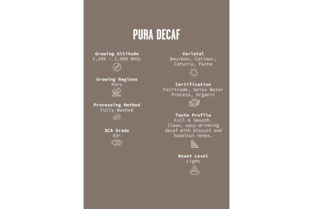Pura Decaf is lightly roasted to create a smooth, satisfying cup. It has a silky-smooth texture, a subtle nutty aroma and a rich chocolate profile with notes of biscuit and hazelnut. Organic and Fairtrade certified, it works brilliantly in traditional espresso and bean-to-cup machines and is equally delicious pre-ground for filter machines.
